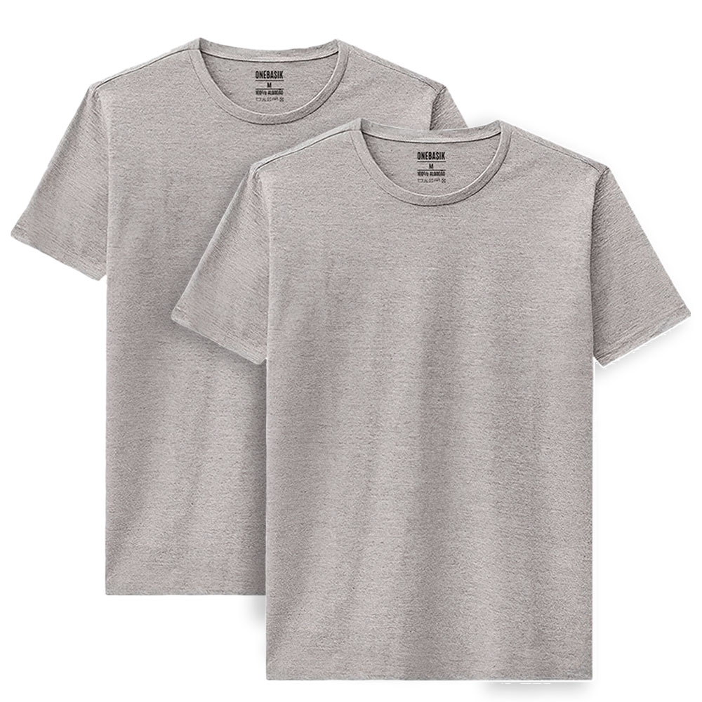 Kit com 2 camisetas masculinas lisas cinza mescla 100% algodão OneBasik. Tecido macio com textura visual diferenciada. Neutro e versátil. Disponível do P ao GG.