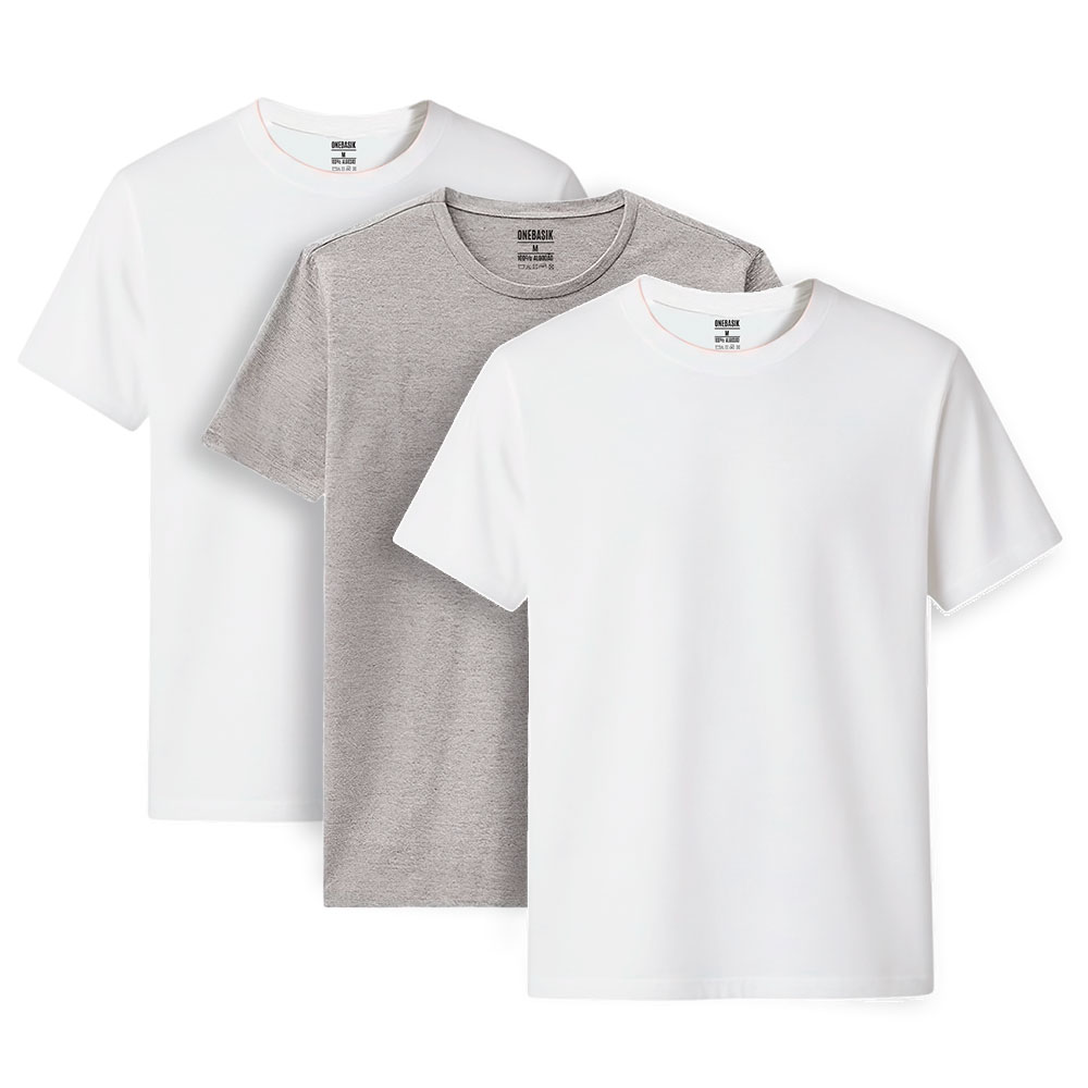 Kit com 3 camisetas masculinas lisas 100% algodão OneBasik: 2 brancas e 1 cinza mescla. Tecido leve, macio e respirável. Combinação clara e moderna. Disponível do P ao GG.