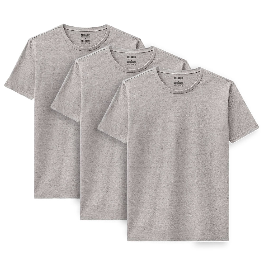 Kit com 3 camisetas masculinas lisas cinza mescla 100% algodão OneBasik. Tecido macio com textura visual diferenciada. Look moderno e neutro. Disponível do P ao GG.